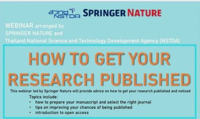 สวทช. ร่วมกับ สำนักพิมพ์ Springer Nature ขอเชิญชวนบุคลากรวิจัย และผู้ที่สนใจ เข้าร่วมงานสัมมนาในรูปแบบออนไลน์ (Webinar) ในหัวข้อ “How to Get Your Research Published”