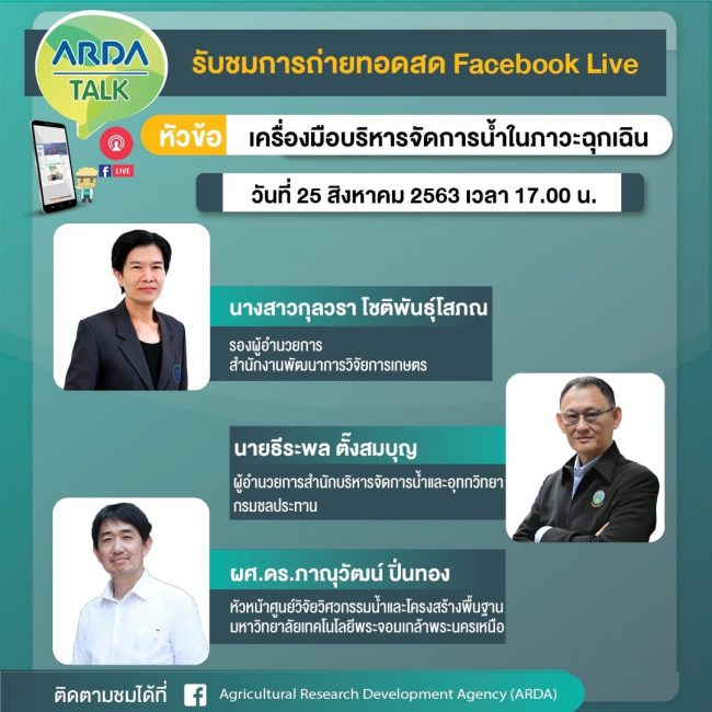 ARDA Talk รับชมการถ่ายทอดสด Facebook Live หัวข้อ เครื่องมือบริหารจัดการน้ำในภาวะฉุกเฉิน