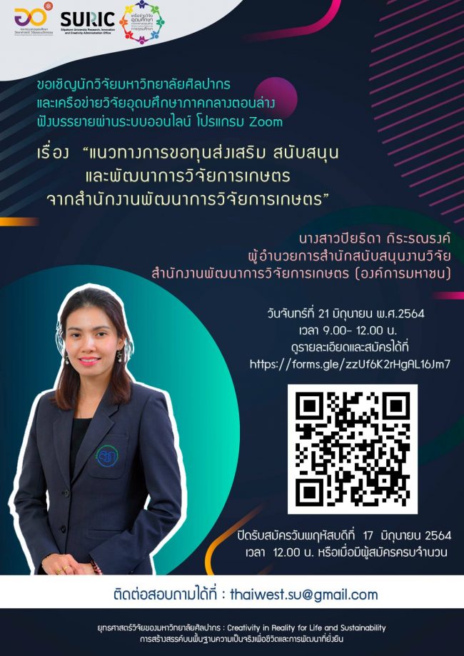 ขอเชิญนักวิจัยมหาวิทยาลัยศิลปากร และเครือข่ายวิจัยอุดมศึกษาภาคกลางตอนล่าง เข้าฟังบรรยาย เรื่อง “แนวทางการขอทุนส่งเสริม สนับสนุน และพัฒนาการวิจัยการเกษตร จากสำนักงานพัฒนาการวิจัยการเกษตร”