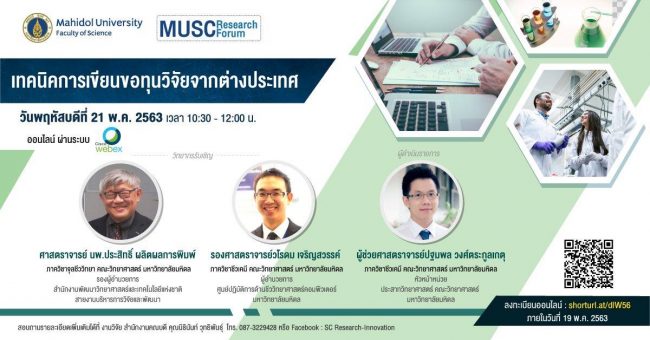 MUSC Research Forum : เทคนิคการเขียนขอทุนวิจัยจากต่างประเทศ วันที่ 21 พ.ค. 2563 เวลา 10:30-12:00 น. ทางออนไลน์ WebEx