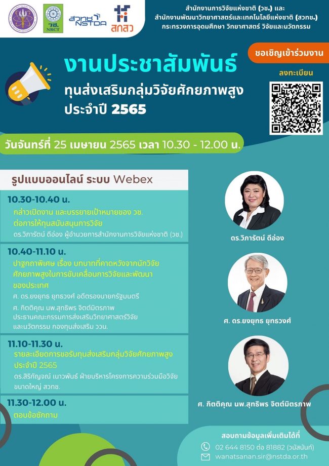 ขอเรียนเชิญเข้าร่วมงานประชาสัมพันธ์ทุนส่งเสริมกลุ่มวิจัยศักยภาพสูง ประจำปี 2565
